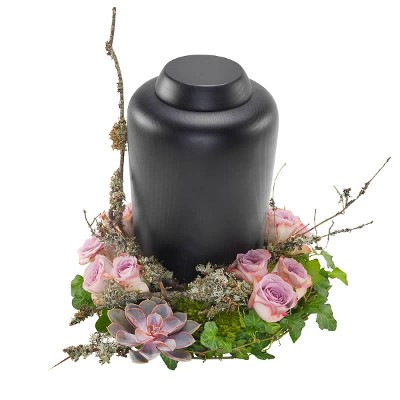 Elegant und geschmackvoll ist dieser Urnenkranz mit lila Blüten. Rose, Echeveria, Moos und Hedera. Direkt von unseren Florist:innen gebunden und geliefert.